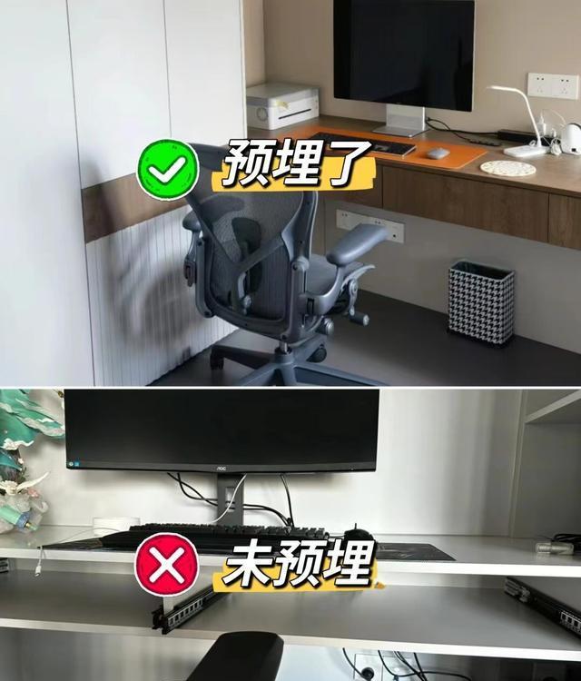 预埋后:在装修时预先铺设好电脑桌所需的电线和网络线管道,电脑桌安装后看起来更加整洁美观。同时,预埋的管道也能保护线缆免受损坏,提升使用体验。