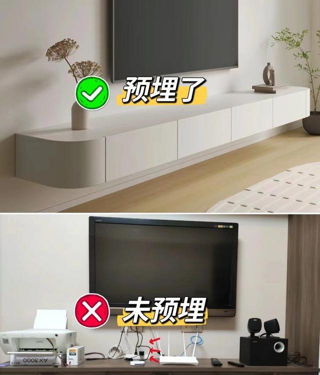 预埋前:没有预埋HDMI线、网线等线缆的电视背景墙,在后期安装电视时需要裸露的线缆,不仅影响美观,还可能因为线缆过多导致信号干扰。