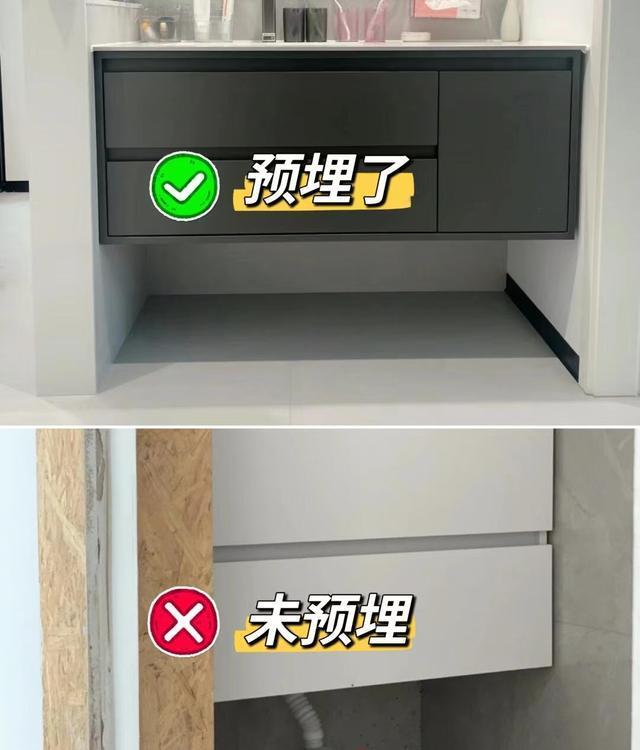 预埋前:没有预埋浴室柜墙排管路的家庭,在安装浴室柜时需要裸露的排水管道,不仅影响美观,还可能因为管道堵塞而导致维修困难。